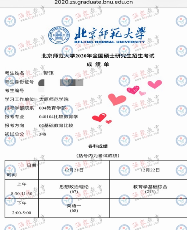 我叫斯琪,本科毕业于太原师范学院,一个地方性师范学校——太原师范学院,一战上岸,一志愿北京师范大学比较教育专业,总分348分(政治67,英语68,专业课213),差了五分进面试,最后调剂到陕西师范大学。我的整个考研历程都与涵毅一同走过,真的很幸运第一年就遇到了姜雪老师、木子姐姐、桐姐和晓艺姐,还有许许多多共同奋斗的朋友们,真的特别特别幸运。