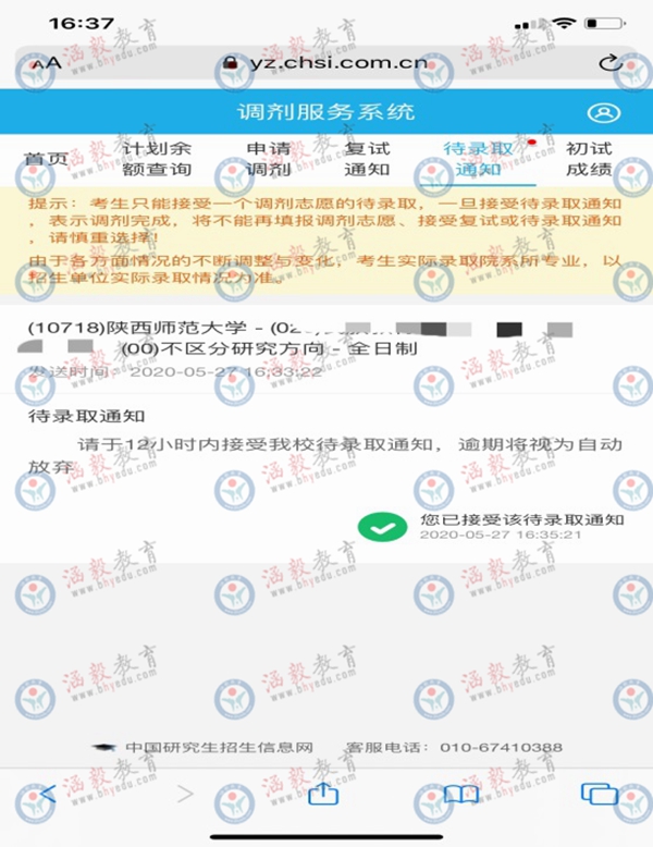 Ps:可能会有人问到不是还收到了河北师大的复试通知吗?河北师大是在28号复试,我27号接受了陕西师大的拟录取就不能再参加别的学校的复试了。河北师大的老师也特别好,之后专门打电话来确认我为什么没参加复试,我告知他原因后他也很开心的祝贺我。