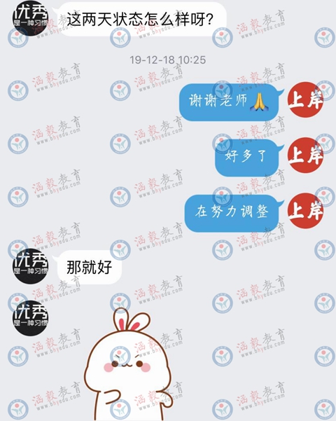 真正忙完一切开始学习已经是7月了,翻开书本发现该忘记的也都忘得差不多了,太久没有长时间学习自己也静不下心,学不下去就开始乱想,我考不上怎么办,没工作怎么办,我今年是不是还应该报上海,报华东师范大学?焦虑之中我接触到了涵毅的旭旭老师,从认识旭旭老师的第一天起,她就特别耐心地解答我所有的问题,认真负责的态度让迷茫中的我仿佛抓住了一根救命稻草,也就是从那一刻起我决定相信涵毅的老师们。