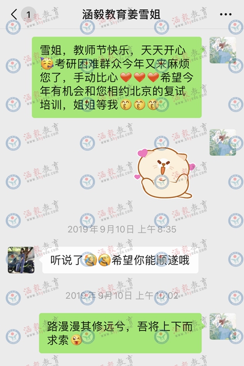 2015年秋,时至教师节,作为一名国际经济与贸易专业的大四学生,因为对所学专业的前途发展不甚自信,也没有获得心仪的offer,同时看好教育学的发展前景,我开始了教育学研究生备考,那时在网上看到涵毅、加了雪姐的QQ,我们聊了起来,可能都是东北姑娘的缘故,非常亲切,没几天就加入了涵毅的大家庭,收到了北京邮来的讲义和光盘,十一的时候来到北京看着一切都很新奇,几天的测试之后根据我的水平,雪姐告知我心向往之的华东师范大学是上不去的,凭着对985学校的执念,最后我定了中山大学,在10月底快接近尾声的时候,雪姐建议我换成华中师范大学,但年轻气盛没有听进去,不出意料的落榜了,这里不得不指出,考研与高考最大的区别就是你对于自身水平的认知很可能是错误的,因为没有全国统一的参照,与此同时,报考非常关键,选择了学校也就选择了你的竞争对手。